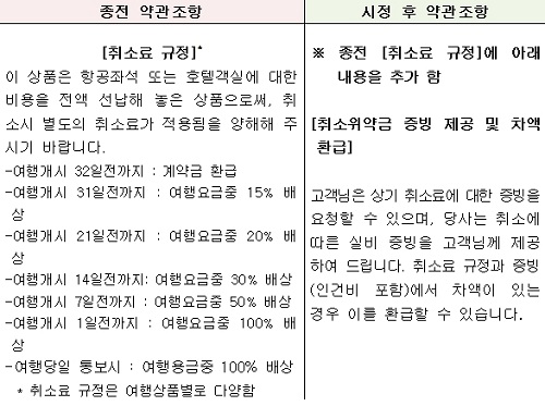 공정위 관계자는 “지금까지 취소 수수료 규정은 계약취소로 여행사들이 실제 부담하는 손해의 크기와 관계없이 자신들이 입을 수 있는 손해의 최대치를 기준으로 수수료를 부과해 왔다”며 “이번 조치에 따라 소비자가 불가피한 사정으로 해외여행 계약을 취소할 경우, 과다한 위약금 부과로 인한 소비자 피해가 감소될 것”으로 전망했다.