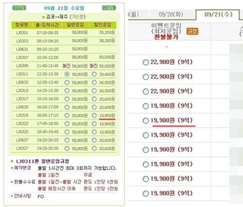 ‘진에어’는 김포발 제주행 편도 항공권(21일기준)을 일반운임 5만8천800원에서 약67% 할인된 1만8천900원에 판매중이지만 환불이 가능하다. 출발 2일 전은 수수료 무료이며 1일 전 취소 요청시 5천원이 부과된다.