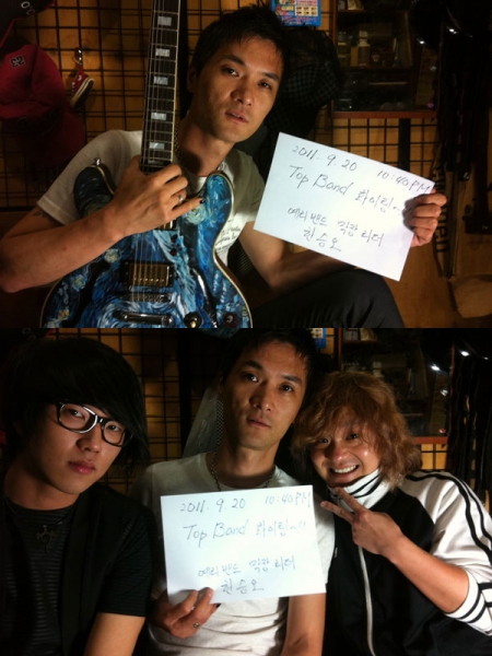 공개된 사진은 예리밴드 리더 한승오와 아이씨사이다가 함께 찍은 사진. ‘2011.9.20 10:40 PM Top Band 화이팅! 예리밴드 막장 리더 한승오’라는 글이 적힌 종이를 들고 있다.