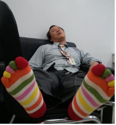 MBC '무한도전' 김태호 PD는 22일 자신의 트위터에 "점심식사 후 '사람이 이렇게 피곤해도 되냐?'하며 잠깐 눈부치신 정과장님. 세상에서 가장 불쌍한 발가락 양말"이라는 글과 함께 정준하의 사진을 올렸다.
