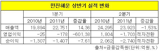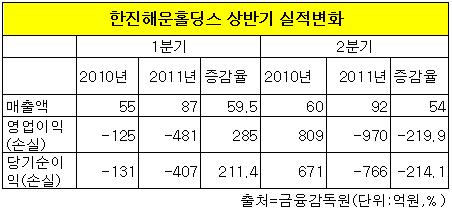 한진해운은 올 상반기 매출액만 5.6% 소폭 늘어났을 뿐 1천880억원의 영업손실을 기록했다. 1분기 1천407억원이던 순손실액은 2분기 2천740억원으로 눈덩이처럼 불어났다. 지주사인 한진해운홀딩스도 올해 상반기 영업손실액이 1분기 481억원에서 2분기에는 970억원으로 2배 이상 늘어났다.