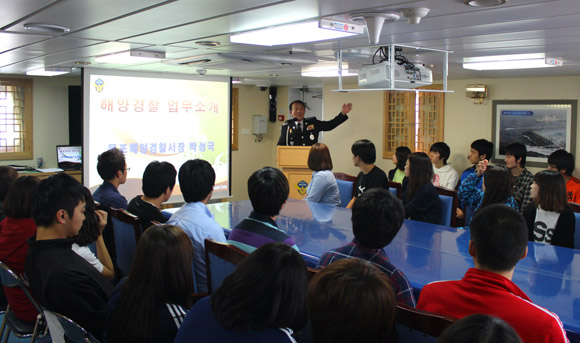 특히 현재 KBS 월화드라마로 방영중인 드라마 포세이돈 속의 해양경찰 모습과 장비들과 실제 해양경찰관들의 역할을 비교 설명하며 학생들에게 생동감 있게 해양경찰을 알리고, 격의 없는 대화를 주고받았다. 이어 대형함정 견학을 통해 해양경찰의 최신 장비를 둘러보고 최 일선 현장에서의 생생한 업무를 청취했다.