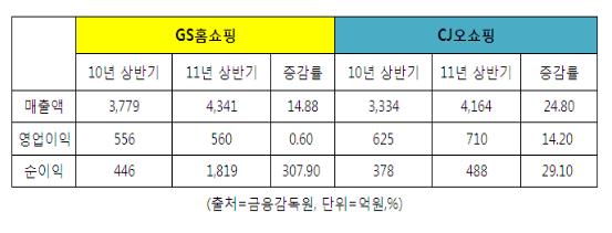 지난 상반기 GS홈쇼핑의 매출은 작년 동기 대비 14.88% 성장한 반면 CJ오쇼핑은 24.8%나 풀쩍 뛰었다. 매출액이 각각 4천341억원, 4천164억원을 기록해 약 177억원의 근소한 차이를 보였다.