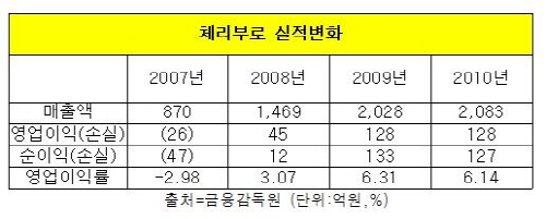 26일 금융감독원에 따르면 체리부로는 지난해 2천83억원(계열사포함 4천500억원)의 매출을 기록했다. 2007년도 매출액 대비 무려 2.5배에 가까운 성장이다.