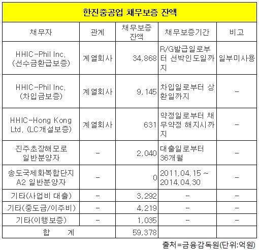 자산규모 7조원인 한진중공업의 채무보증 잔액이 무려 6조원에 달해 재무 지표에 빨간불이 켜졌다.
