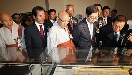 23일 ‘2011 대장경 천년 세계문화축전’을 통해 팔만대장경 진본의 모습이 일반인에게 공개됐다. 이날에는 국보 32호 ‘마하반야바라미다심경’과 국보 206호 ‘화엄경 변상도’로 총 두 점이 전시됐다.