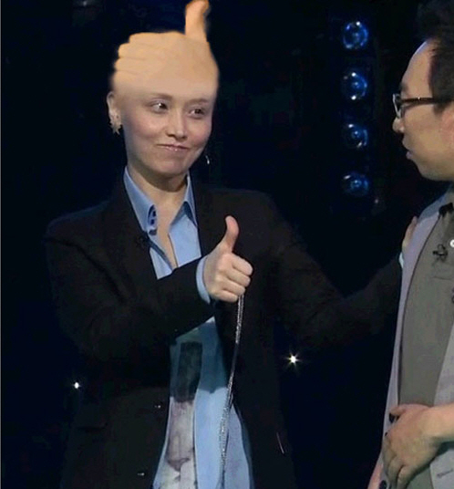 패러디한 사진 속 이소라의 모습은 박박 깎은 민머리 위에 최고를 표현하는 엄지손가락이 얹혀져 있다.