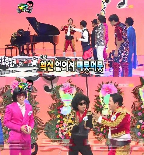 이어 박명수가 "이봉원선배가 이주일 흉내를 잘 내셨어요. 그 흉내를 똑같이 내면 인정할게요"라고 하자 정재형은 "콩나물 팍팍 무쳤냐?"를 연기해 주위를 웃음바다로 만들었다.(사진=MBC 화면캡처)