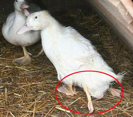 영국 일간지 메트로 보도에 따르면, 이 오리는 다른 오리들과 달리 몸집이 약간 크고 땅을 버티고 선 다리 2개 뒤로 작은 다리 2개가 삐죽 나와 모습이 보인다.