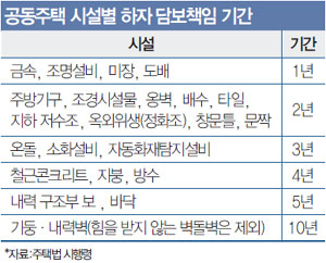 아파트 하자보수기간은 현행 주택법상 하자 종류에 따라 준공 후 1년에서 10년이다. 누수에 대한 하자보수기간은 4년으로 준공일이 6년이 넘은 김 씨의 아파트는 이미 보수기간을 넘긴 상태.