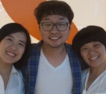 사진 속 박휘순은 KBS '개그콘서트'의 '헬스걸' 코너의 권미진, 이희경을 양팔로 감싸 안으며 환하게 미소짓고 있다.