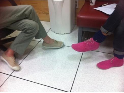 사진은 정재형 유희열의 발만 찍은 모습이다. 정재형은 핑크색 스웨이드 신발을 신고 있고 유희열은 발목을 드러낸 채 베이지색 단화를 신고 있다.