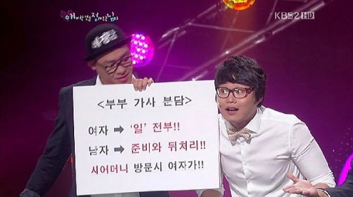 애정남 최효종은 “여자가 일을 잘하는 것을 인정해서 가사 일은 여자가 하는 것으로 정한다”며 “준비와 뒤처리는 남자가 하는 것”이라고 말했다.