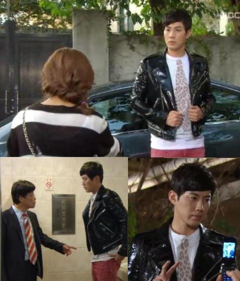 장우진(류진)은 어린 약혼녀를 위해 가죽 재킷과 스키니진으로 젊어 보이려고 노력한 모습이 역력하다.