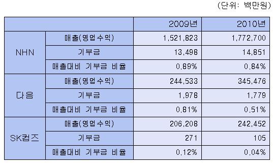 다음과 SK컴즈의 경우 그 전해에 비해 매출(영업수익)이 큰 폭으로 늘어났음에도 기부금 규모를 오히려 줄여 매출 대비 기부금 비율도 크게 줄어들었다. 다음의 경우 0.81%에서 0.51%로 감소했고 SK컴즈는 0.12%에서 0.04%로 1/3토막났다.