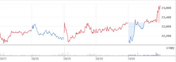 코오롱 주가는 4일 2만4천150원으로 전 거래일대비 1천100원(+4.77%)오르며 장을 마감했다.