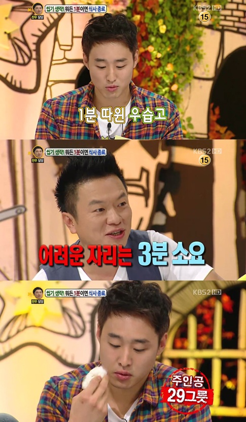 10월3일 방송된 KBS ‘안녕하세요’에서는 1분 식사남이 출연해 1분 안에 모든 음식을 먹어 사회생활이 힘들다고 해 화제를 모았다.