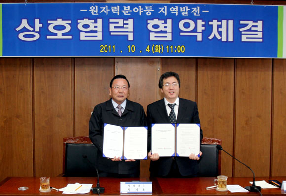 영광군수와 한국원자력학회 학회장 장순흥 교수는 지난 4일 영광군청 영상회의실에서 지역발전과 원자력 분야의 상호발전을 위한 협약식을 가졌다.