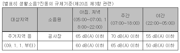 소음ㆍ진동관리법에서는 최소 50DB에서 최대 70D까리로 분류, 낮에는 사람의 큰 목소리, 밤에는 사무실 내 소음 정도를 규제의 기준으로 보고 있다.
