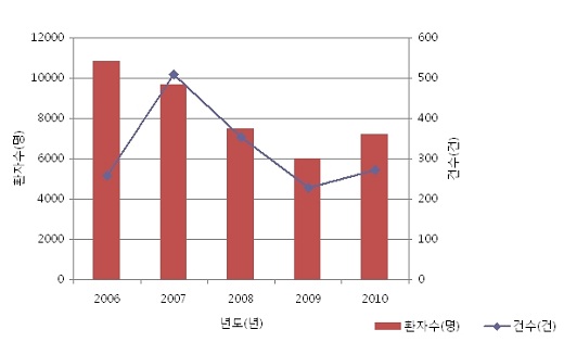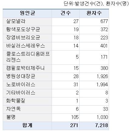 식품의약품안전청에서 발표한 연도별 식중독 발생현황에 따르면 지난 2010년 식중독 발생건수는 271건으로 환자 수는 7천218명에 달했다.