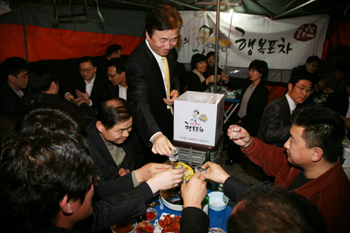 작년 3월부터 웅진코웨이 본사 앞에는 매월 포장마차가 등장한다. 포장마차 주인은 다름 아닌 홍준기 사장. 사장이 직접 안주를 만들고 술을 파는 '해피홍의 달리는 행복포차'에는 매달 전국에 있는 영업조직과 본사 식구들로 북적인다.