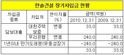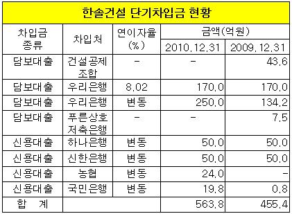 한솔건설의 2010년 감사보고서를 살펴보면, 우리은행으로부터 담보대출로 단기차입금 563억8천만원 중 420억원(74.5%)을 빌렸다. 장기차입금도 240억원이나 빌렸고, 지난 3월 2년 만기인 사채도 90억원이나 된다.