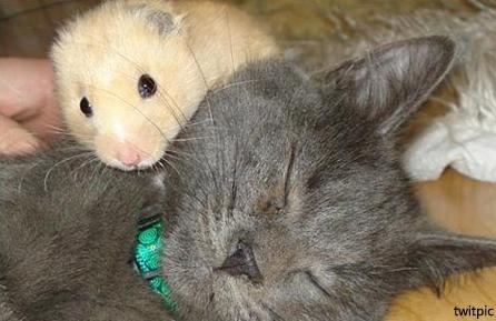사진을 접한 네티즌들은은 "겁이 없는 햄스터" "두 눈을 질끈 감은 고양이는 자신의 운명을 알지 못한다. 곧 뱀파이어 고양이가 될 것" 등의 반응을 보였다.(사진=해외 온라인 커뮤니티)