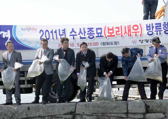 영광군(군수 정기호)은 지난 5일 염산면 향하도항에서 보리새우 1천600천미를 방류했다.