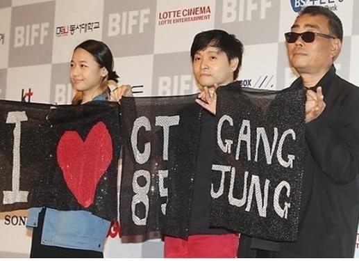 공개된 사진은 여균동과 배우 김꽃비, 김조광수 감독이 함께 ‘I ♡ CT85, GANG JUNG’이라는 문구가 쓰여 있는 검은 천을 들고 레드카펫 위에 서 있다.