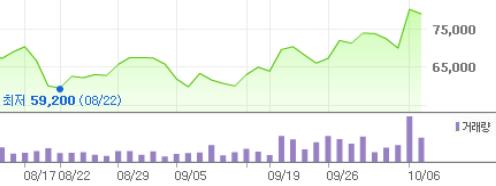 삼성전기 주가는 지난 8월 22일 신저가(5만9천200원)를 기록한 이후 서서히 회복세를 밟아왔다. 이전의 하락폭이 워낙에 컸던 데다 삼성전자를 비롯한 국내 IT주의 전반적인 상승추세에 힘입었다는 해석이다.