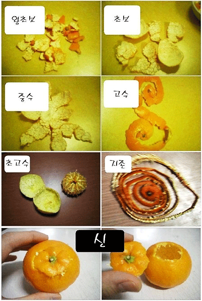 사진 속에는 왕초보,초보, 중수, 고수, 초고수, 지존, 신 등급으로 나뉘어 각각 다른 모양으로 귤껍질을 벗긴 모습이 담겨 있다.