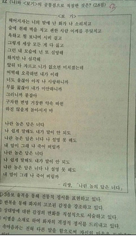 URL복사 기사공유하기 스크랩 프린트 메일보내기 글씨키우기 시험문제로 리쌍의 노래를 출제한 학교가 어디인지 네티즌들의 궁금증이 커지고 있다.네티즌들은 "센스 만점 학교는 어디?", "센스 대박~", "이 학교 학생들 깜짝 놀랐겠다"는 등의 반응을 보였다.한편 길은 7일 자신의 트위터에 “학교시험에 ‘나란 놈은 답은 너다’ 떴어요! 리쌍 시험지에까지 진출”라는 글을 리트윗했다. 공개된 사진 속에는 리쌍의 노래 ‘나란 놈은 답은 너다’ 가사가 보기로 등장한 시험문제가 등장했다.(사진-트위터) 저작권자 © 소비자가 만드는 신문 무단전재 및 재배포 금지 온라인 뉴스팀 다른기사 보기 URL복사 기사공유하기 주요기사 GS그룹, 허용수·허세홍 부회장 승진...허철홍, GS엔텍 대표 선임 네이버파이낸셜-두나무 20조 원 빅딜 성립... 공룡 빅테크 탄생 [인사] 현대해상 김동연 지사, "여성폭력 근절 경기도가 함께 할 것"...젠더폭력 통합대응단, 4만488명 지원 롯데건설, '부도설' 최초 유포자 경찰 고소…"허위사실 유포 강력 대응" 롯데, 세대교체 단행...부회장 전원 용퇴·CEO 3분의 1 물갈이