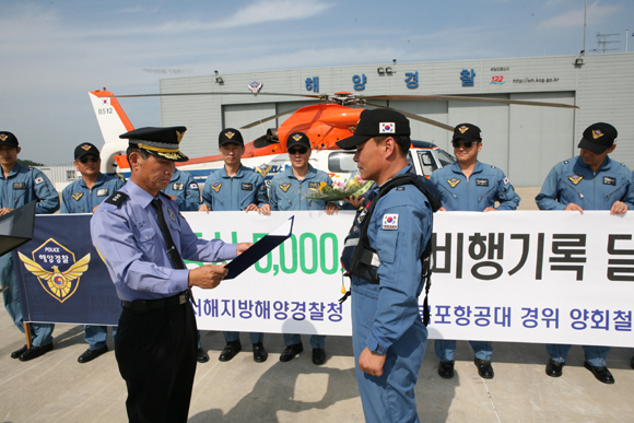 서해지방해양경찰청(청장 이주성)은 10일 목포항공대에서 개인 무사고비행 5천시간이라는 대기록을 수립한 경위 양회철 조종사를 축하하기 위해 항공대 직원들이 참석한 가운데 꽃다발 전달과 표창수여 등 기념행사를 가졌다.