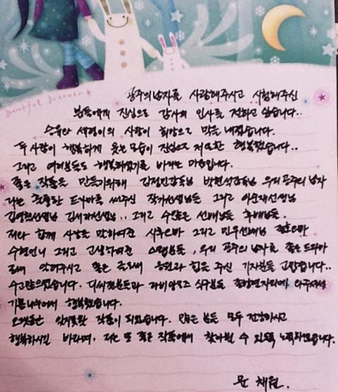 문채원은 10일 자신의 미투데이에 “공남 끝나고 감사의 글을 바로 올리려 했는데 이제야 여유가 생겨 올려요. 200자에 모두 담기엔 하고 싶은 말도 감사할 분들도 많아 편지에 담아올립니다!”라며 자필편지를 게재했다.