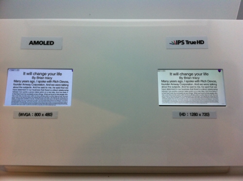 이를 뒷바침하기 위해 LG전자는 경쟁사인 삼성전자 갤럭시S2 LTE(800x480)와 자사의 IPS True HD 디스플레이의 비교시연회를 열었다.