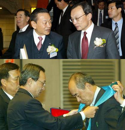 <조남욱 삼부토건 회장(상단 왼쪽)이 2005년 1월 이해찬 총리와 한국경영자총연합회를 나서고 있다.