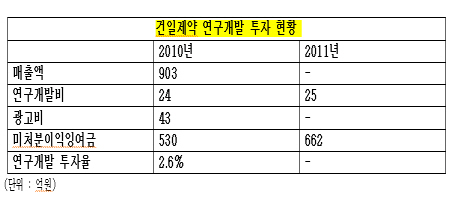 지난해 건일제약의 실적은 매출액 903억원, 영업이익 97억원, 당기순이익 146억원이다. 그러나 연구개발 투자는 24억원에 불과해 매출액 대비 연구개발 투자율은 2.6%에 그쳤다.