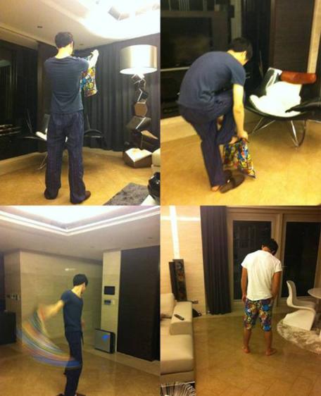 사진에서 김재중은 뒷모습을 보이며 파자마를 던지는 시늉을 하고 있다.