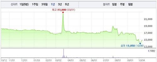 지난 6일 1만3천850원까지 떨어졌던 것에 비해 양호한 편이지만 1년 전(1만8천150원)과 비교해 약세를 보이고 있는 상황이다.