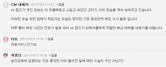 SK컴즈 관계자는 "일단 우리 쪽의 과실 정도를 판단하기 어렵고 그에 따른 보상액을 책정하기도 쉽지 않은 상황"이라며 "웬만한 보상액을 제시한다고 하더라도 과연 이용자들이 만족할 수 있을지는 미지수 아니겠냐"라고 전했다.
