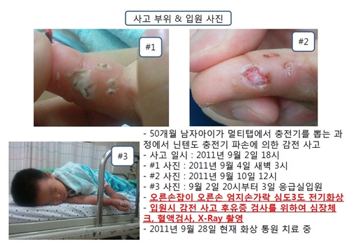 기기 사용 2년만인 지난 9월 2일, 김 씨의 아들(5세)은 멀티탭에서 닌텐도DS라이트 어댑터를 빼던 중 파손되면서 노출된 기판에 손가락이 닿아 감전 사고를 당했다.