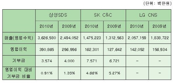 특히, 삼성SDS는 2010년 한 해 동안 전자조달시스템 구축사업 및 전자정부사업 등을 잇달아 수주하며 매출을 전년보다 45.4% 늘렸음에도 같은 기간 기부금은 오히려 10.65%나 줄어들었다.