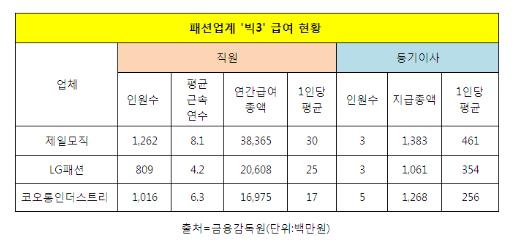 임원과 직원의 1인당 평균 지급액 차이는 제일모직과 코오롱인더스트리가 각각 약 15배로 가장 컸고 LG패션이 14배의 격차를 보였다.