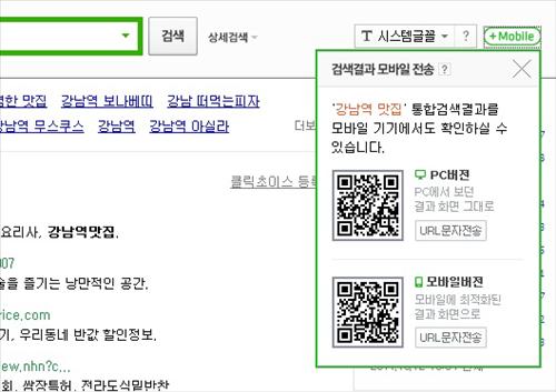 예를 들어, PC에서 네이버 검색창에 '강남역 맛집'이라는 키워드를 입력하면 검색 결과값과 함께 우측 상단에 '+Mobile'이라는 아이콘이 표시되는데 이 아이콘을 클릭하면 QR코드와 단축 URL이 자동으로 생성돼 본인이나 지인의 모바일로 해당 페이지를 바로 보낼 수 있다.