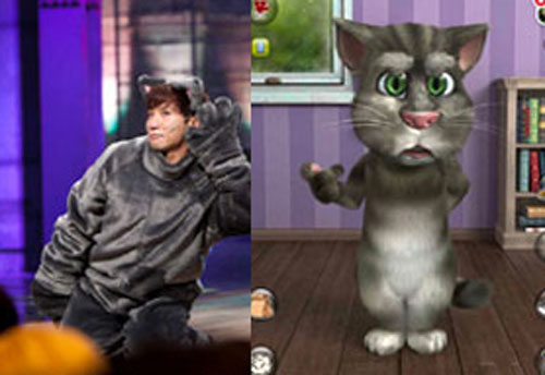 조련사 유상무에게 길들여진 도둑고양이로 등장한 유세윤은 갑자기 일어서 ‘말하는 고양이 톰’의 특징적인 행동들을 싱크로율 100%로 재연했다.