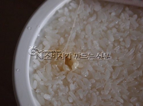 밥 속에서 껌처럼 늘어나는 누런색의 끈적끈적한 물질을 발견한 한 씨는 혹시나 싶어 나머지 제품도 확인하자 마찬가지였다.