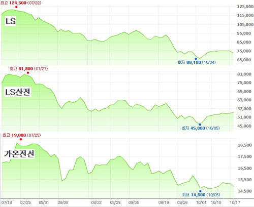 LS산전은 전날 보다 1.12% 오른 5만4천300원에 장을 마감하긴 했으나 7월말 8만원을 넘어섰던 것에 비하면 여전히 34% 가량 하락한 상태다.