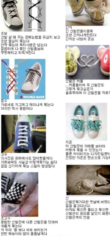 신발 끈 묶는 레벨의 가장 초보는 신발을 살 때 묶여있던 끈 모양을 보고 따라 묶는 사람이며 특히 가장 높은 등급인 신은 신발끈은 묶으면 풀리는 원리를 터득해 그대로 내버려두는 단계라고 설명돼 있어 웃음을 주고 있다.