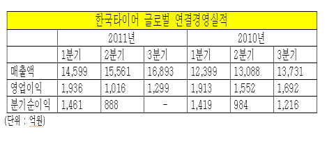 글로벌 연결 기준 한국타이어의 1~3분기 누적 매출액은 4조7천53억원으로 전년동기(3조9천218억원) 대비 19.9% 증가했다. 그러나 같은 기간 영업이익은 5천157억원에서 4천251억원으로 17.5% 감소했다.