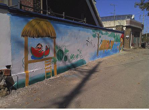 두 번째는 마을사람들의 참여이다. 사업 초기 공모에서부터 기초작업, 중간작업까지는 모든 주민들이 내일인 양 발 벗고 나서 사업을 진행하였다는 점이다. 비교적 전문가의 손길이 필요한 마지막 벽화그리기 작업은 이장 자녀를 포함한 대학생들의 봉사로 이뤄졌다.